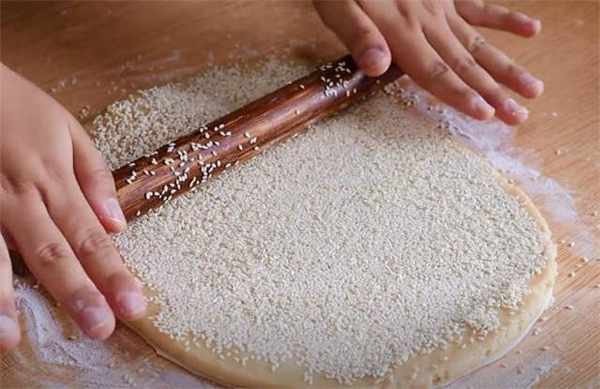7.这时候继续在表面刷水,尽量的多撒一些芝麻,这样炸出来的味道会更香,再稍微的擀一下,这样芝麻可以粘的更牢固。