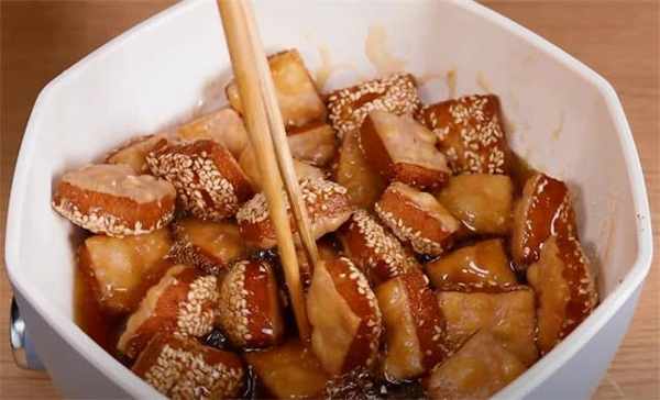 11.这个是提前熬好的糖浆,炸好之后直接放在里面浸泡30分钟左右,糖浆的做法:200g麦芽糖、200g白糖、150g清水,小火煮至沸腾冒大泡即可。