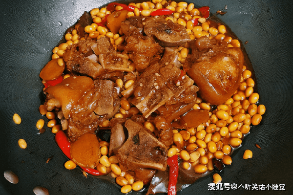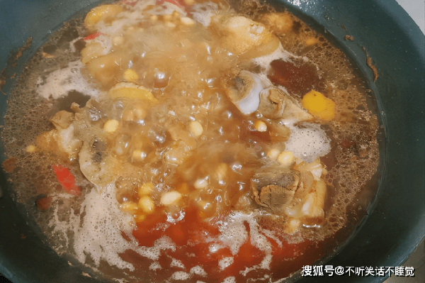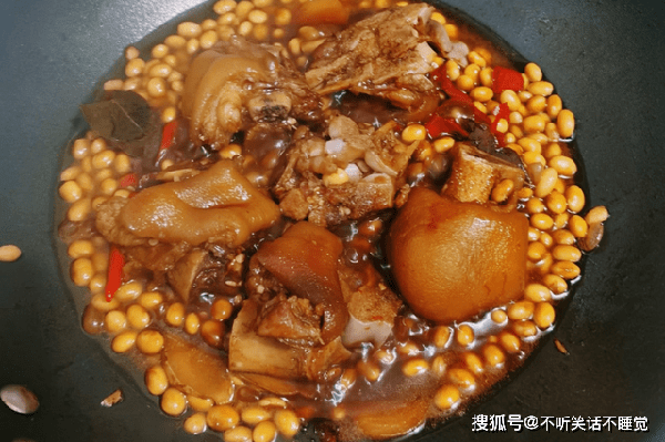 5、加入没过猪蹄的水,一次性加足,中途不可再次添加,倒入泡好的黄豆,大火烧开转小火慢炖,普通锅需要100分钟,中间可以翻动几次,但不要频繁。