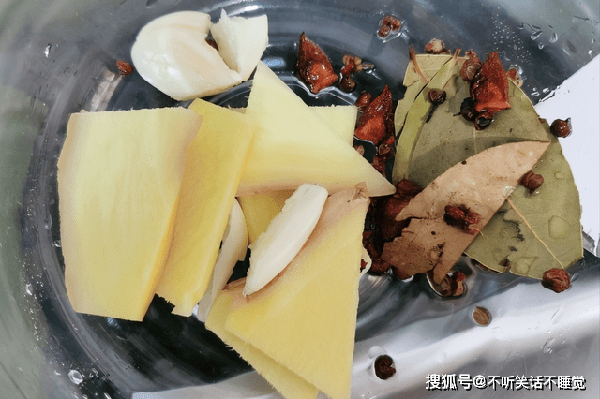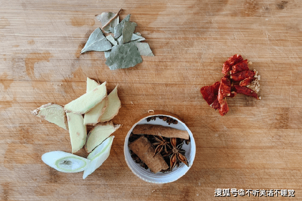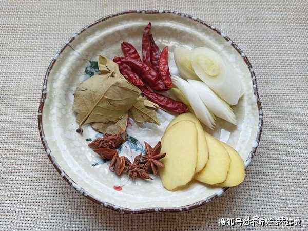 3、开始准备辅料,香叶2片,干辣椒1个,桂皮1块,八角2个,生姜5片,大葱3段,花椒一小把,辣椒的用量根据个人口味。