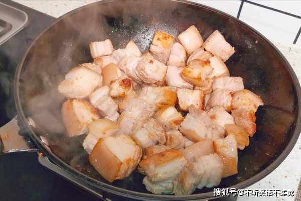 2、准备一口平底锅,无需倒油,开中小火加热,把肉块均匀地码放在锅底,随着锅底温度升高,会渐渐煎出油脂,记得勤翻面,让肉块受热均匀,煎出的肥油倒掉不要,这样可以减少油腻性。