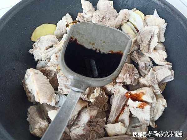4、等上色完成,倒入灵魂的料汁,1勺老抽,3勺生抽,半勺料酒,继续翻炒均匀。