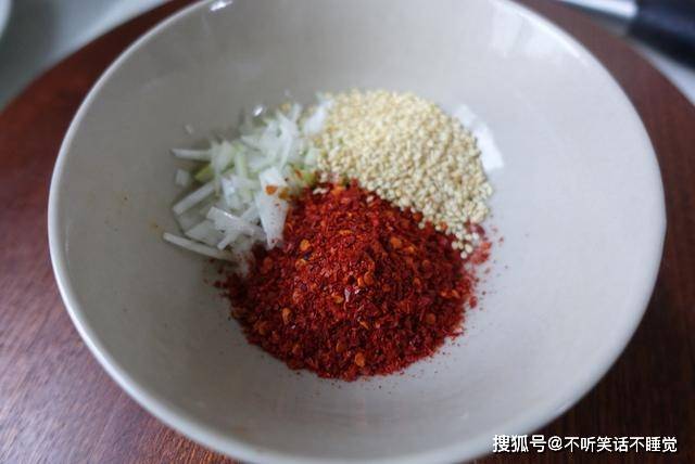 4、趁着煮羊肉的时间,这边可以调一个蘸料,碗中放入辣椒面、白芝麻、洋葱末,辣椒面的辣度可以自行选择,二荆条比较中规中矩。