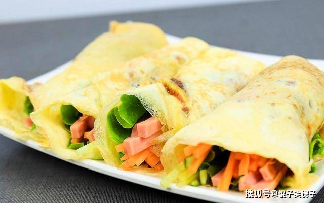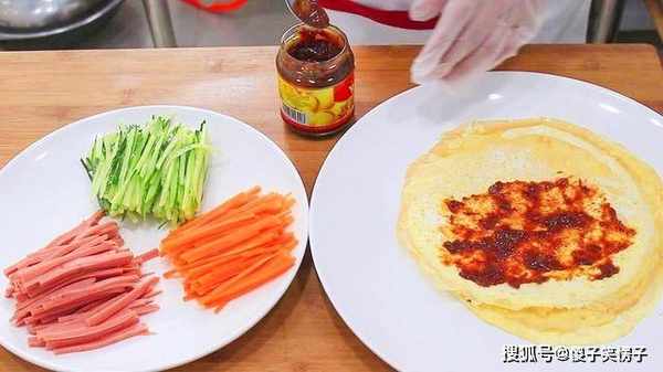 在鸡蛋饼上面抹上一层黄豆酱,放上一片生菜,然后分别放上火腿、胡萝卜和黄瓜丝,卷起来就可以食用了。