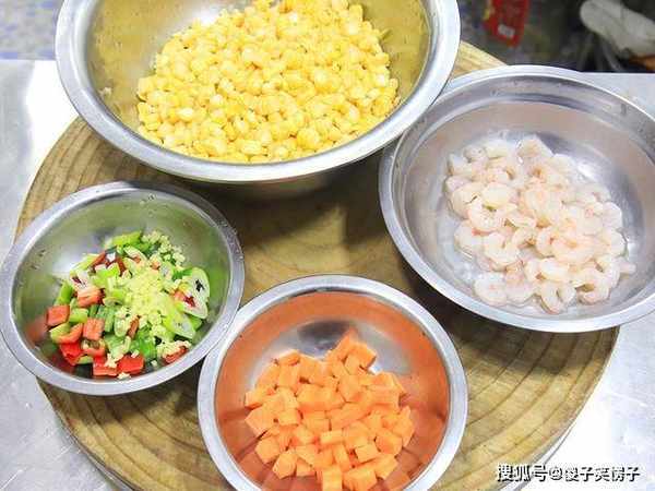 鲜虾仁挑出虾线清洗干净;玉米粒用清水淘洗干净;一小段胡萝卜切成丁;青红椒各半个切成小粒;大葱切成葱花;生姜切成末。