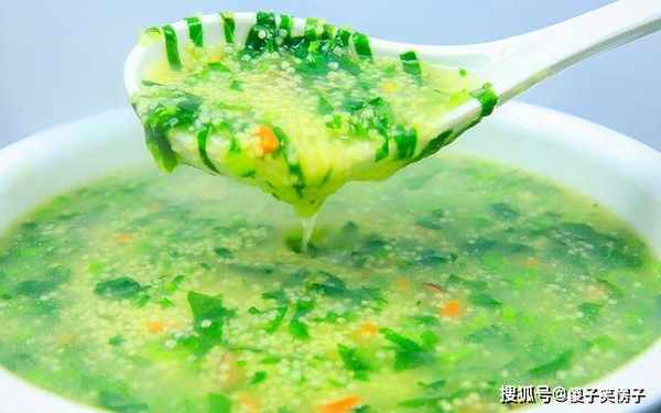 锅内再烧水,水烧开以后把小米倒进去,加入一勺食盐、一勺鸡粉搅匀,水再次沸腾以后转为小火,倒入红枣粒和胡萝卜丁,撇干净浮沫再熬制3分钟,倒入芥兰搅拌均匀,煮至小米羹微微烧开,再勾入半勺芡粉搅匀,把小米羹调得稠一点,小米粥再次煮开以后,美味即成。