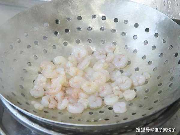 锅内再烧水,倒入虾仁快速煮30秒钟,虾仁微微变红以后倒出,用清水冲洗干净控水备用。