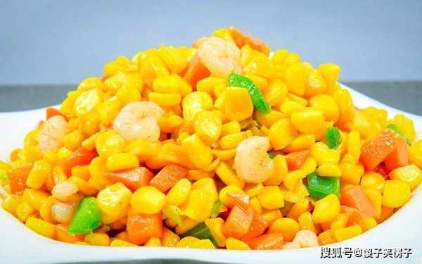 热锅凉油,倒入葱姜、青红椒炒出香味,倒入胡萝卜丁翻炒30秒钟,倒入虾仁和玉米粒颠锅翻炒1分钟,玉米炒香以后加入少许清水、食盐2克、鸡精2克、胡椒粉1克,转大火把调料炒散炒均匀,再淋点香油翻匀,即可出锅。