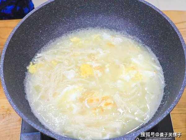 水烧开以后倒入金针菇,大概煮1分钟,加入适量的食盐、适量的胡椒粉即可,然后倒入白菜叶、粉丝放入锅中搅拌均匀,再倒入西红柿薄片煮30秒,加入一点香醋去除一下鸡蛋的腥味,出锅前淋入一点香油,撒上几粒葱花美味即成。