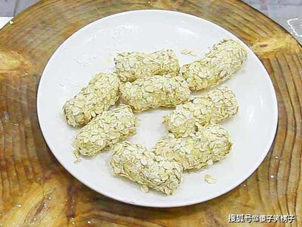 四根香蕉剥掉香蕉皮切去两边的尖头,再切成四厘米左右的段放在盘中;一个盆倒入淀粉;另一个盆打入一个鸡蛋,用筷子快速把鸡蛋打散;再准备一个盆倒入燕麦片。
