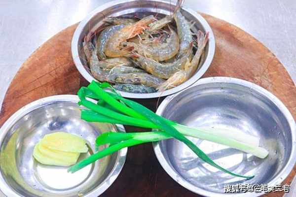 锅内烧水,放入姜片和葱段,淋入一点料酒去腥,水烧开以后再煮1分钟,把葱姜的香味煮出来,方便达到去腥的目的。水充分沸腾以后放入大虾,煮至虾身呈嫩红色时,放入少许食盐增加底味,注意盐一定要等虾煮熟后再放,以免虾肉中的水分流失,吃着不够鲜嫩。