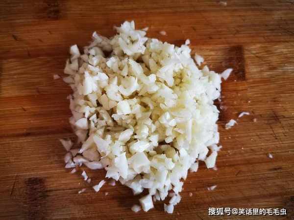2、取来新鲜的大蒜,洗净,用刀拍一下,去皮,之后剁成碎末。用刀拍过的大蒜更容易把皮去掉,而且还不伤手指,我就是这几天剥大蒜剥的,手指甲都有点痛呢,大家可以试试这方法。