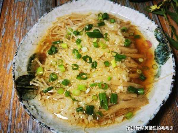 7、之后重新倒在金针菇上面,撒上些葱花就可以吃了,真的特别好吃呢,金针菇这样做,最大程度的保留了它的口感和营养,本身的鲜美配上蒜蓉简直就是绝配,做法简单,一看就会,感兴趣的小伙伴可以在家里试试哦。