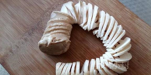 2菜刀与杏鲍菇成直角切下,离底部还有1厘米停下,不要切断。然后间隔0.5厘米再如此切下,一直切到尾部