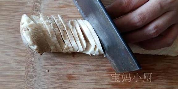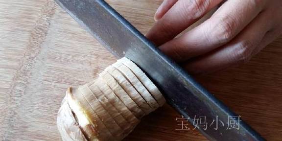 宝妈小贴士:切杏鲍菇如果没把握,可放两只筷子,与杏鲍菇平行,菜刀切到筷子自然就停住了