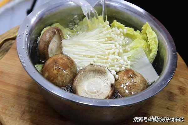 首先,我们准备几片白菜叶放入盆中,一把金针菇切去根部,香菇几朵、把蒂去除,一起用清水洗干净。