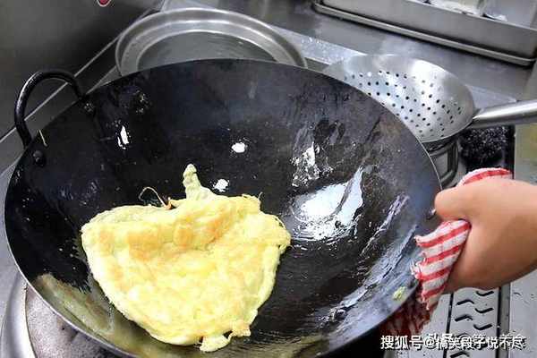 碗中打入两个鸡蛋,加入少许食盐和白醋搅拌均匀。锅内烧油、充分滑锅以后倒出热油、加入凉油,然后倒入蛋液,开小火煎来回多翻几次、煎成蛋饼。