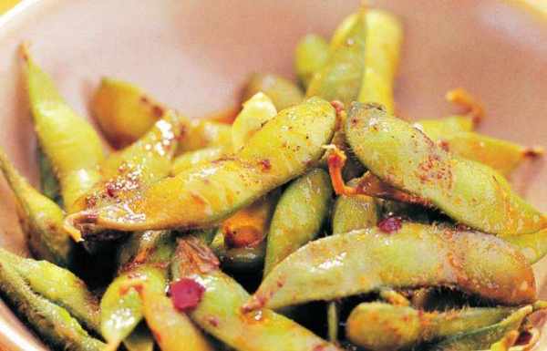 材料:新鲜毛豆200克,葱段25克,姜片10克,八角3粒,黑胡椒粒1大匙,精盐、料酒各少许,白糖、辣椒油、香油各1小匙。