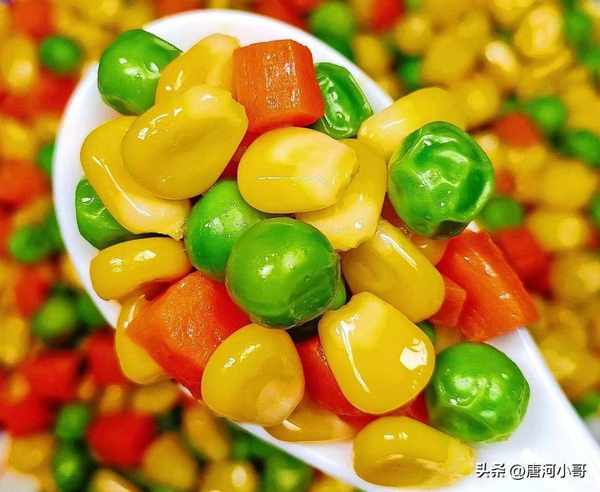 食材:豌豆粒200克,甜玉米粒200克,胡萝卜200克,葱花少许。