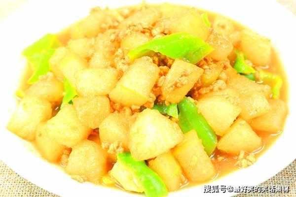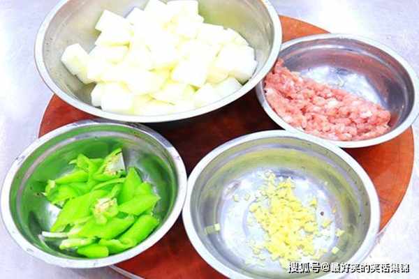 半个冬瓜去皮、切成小块;一小块里脊肉剁成肉丁;青椒切成片用来配色;再切点姜末备用。