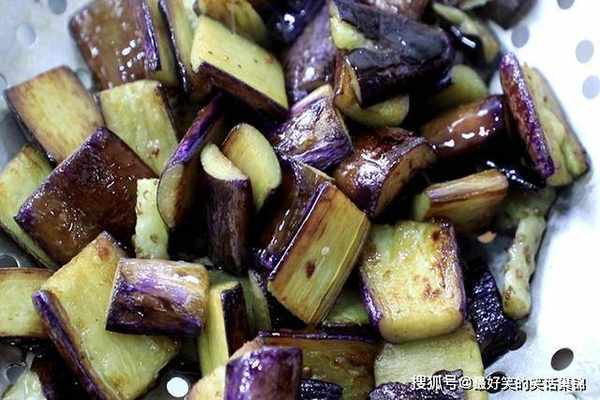 锅内烧油、油烧热以后倒入茄子进行翻炒,用勺子按压茄块,炒出茄子中的水分,茄子炒软炒香以后倒出控备用。