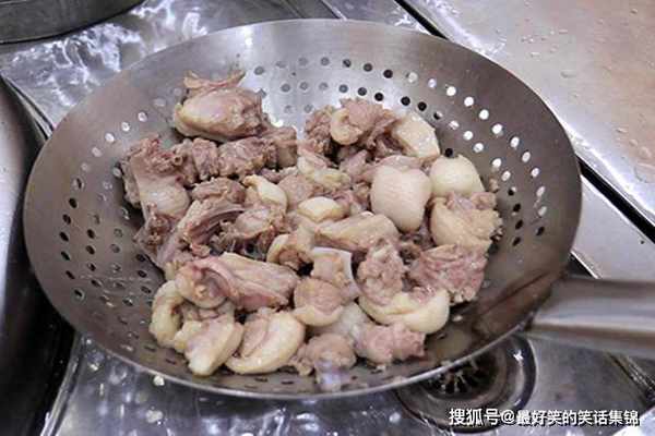 鸭块冷水放入锅中焯一下水,倒入一点料酒去腥,煮出鸭肉的血水和杂质,水烧开以后打去锅中的浮沫,大约煮2分钟把鸭块倒出来,用清水冲洗干净备用。