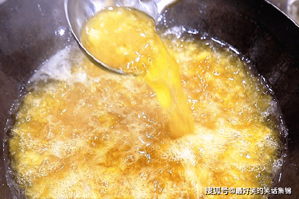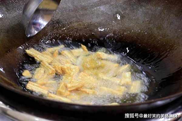 锅内烧油,油温5成热时把腐竹倒入锅中,快速炸30秒钟,腐竹变色起泡以后倒出来控油。