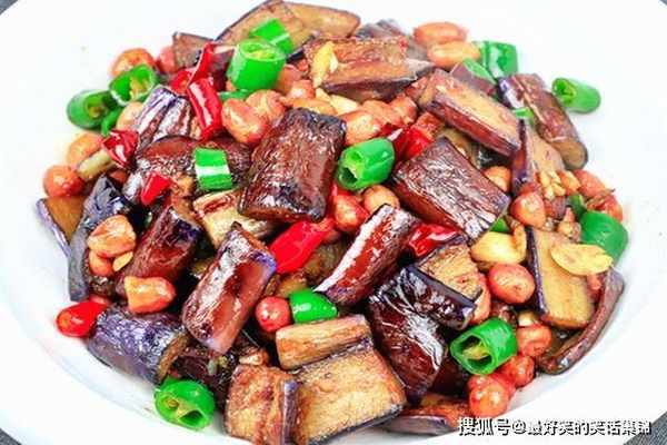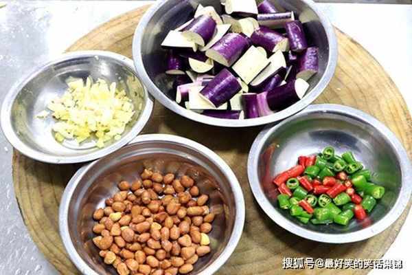 准备几个鲜嫩的紫茄子,清洗干净以后去除根蒂、切成段;青红椒都切成圈、用来配色;再切点蒜末、姜末放一起,准备一把油炸花生米备用。