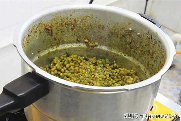 绿豆提前浸泡一个晚上,放入高压锅中,加入适量的清水,大火烧开压15分钟,把绿豆煮烂、煮出沙。