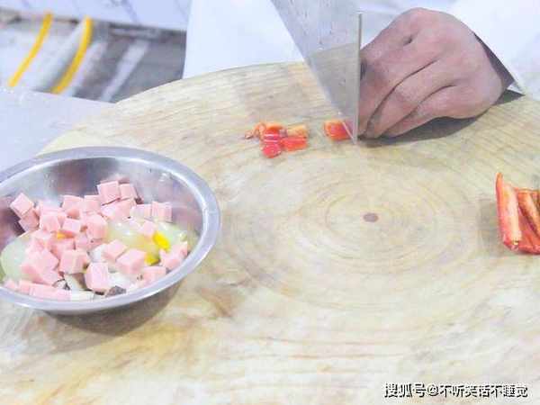 将一颗娃娃菜洗净,切去根部后切成四份;香菇切成香菇粒;一个松花蛋切成碎;一根火腿切成粒;青红椒各一个去籽切成粒;大葱斜切圈,大蒜切片备用。