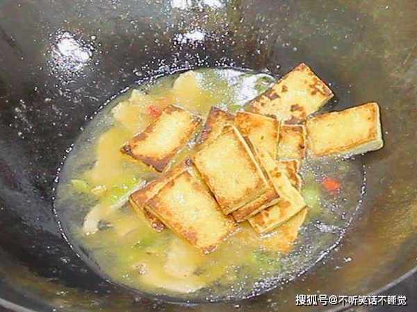 锅中烧油,倒入葱、姜、蒜和小米椒翻炒出香味,再倒入肉片煸炒出猪肉的香味,淋入料酒和适量清水,然后放入煎好的豆腐。