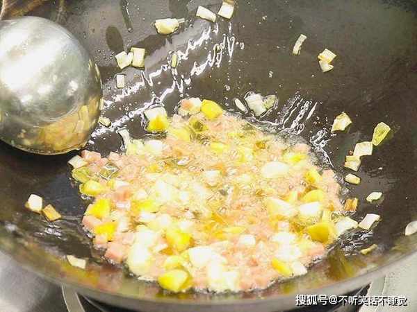 锅内烧油,油温五成热时倒入葱蒜炸香,再放入切好的火腿和变蛋翻炒出香味,然后加入适量的清水,开大火炖煮把汤炖白,放入娃娃菜后开始调味。