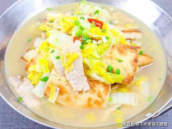 将400克豆腐切成厚片;两个娃娃菜从中间切成两半,再切成宽条放入淡盐水中浸泡几分钟;一块生姜切成薄片;小米椒切成辣椒圈;大蒜切成薄片;大葱切成马蹄片;猪肉100克切成肉片。