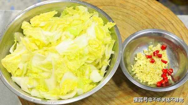 将两颗娃娃菜清洗干净,然后把叶片一片一片地剥下放入盘中;两段大葱白划开后切成葱丝,半个红椒去籽后切成细丝,一起放在清水中浸泡一会儿。
