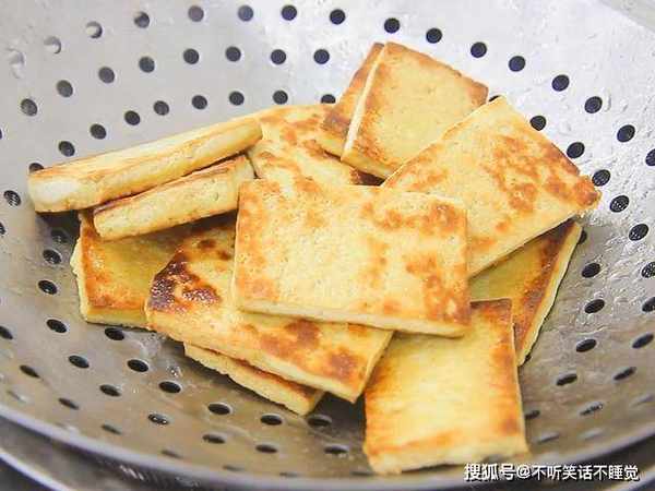 热锅凉油,然后撒入食盐防止粘锅,然后放入豆腐片轻轻晃动锅,让豆腐均匀地受热,小火将底面煎至金黄后翻面,等到煎至两面金黄的时候,倒出豆腐控油。