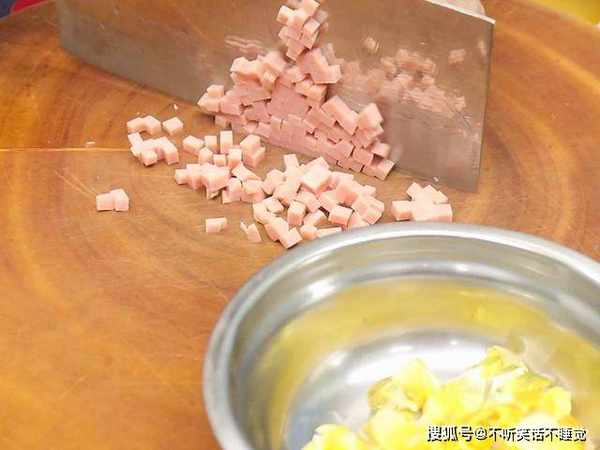 大葱破开切成葱花;大蒜去除两头切成粒;两个松花蛋切成小块;半根火腿肠切成碎丁;三颗小娃娃菜去除根部后切成长条备用。