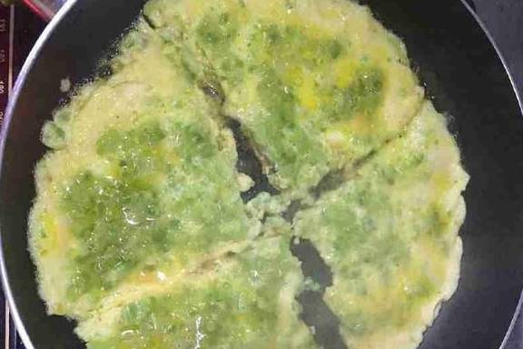 6.中火煎制,到蛋液稍定型,用锅铲将其分成四等份。