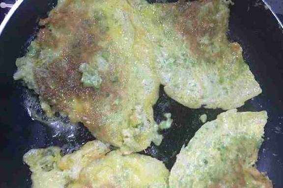 7.翻蛋饼,稍煎另一面。即可出锅装盘。