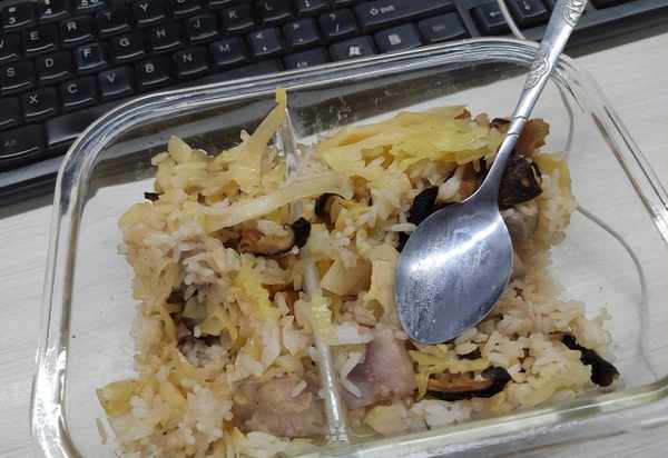 王倩楠还会炖鸡,把鸡翅鸡腿留着中午吃,幸福感会加倍,如果晚上胃口好,还会买烧鹅卤味等,中午就会多几样菜,这些都是月初吃的,虽然只有简单一两个菜,但是足够她吃尽兴。到了月底就不一样了,一点咸肉香菇焖个米饭就是一顿,看得出来王倩楠晚上也没做几个菜,所以中午吃得也比较差。