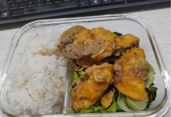 看看王倩楠月初吃的饭,有这个蛋包肉,还有生菜,晚上自己做的蛋包肉,把鸡蛋打散成蛋液,然后摊成蛋饼,中间放入肉馅儿,里面放了香菇,吃起来一点也不油腻,还有一股菇类 的鲜味。最后裹在一起油煎一下定型。晚上没吃完的,第二天早上装到饭盒里,担心太油腻还垫了新鲜的生菜,这样生菜也算一个素菜,荤素结合营养也均衡了。