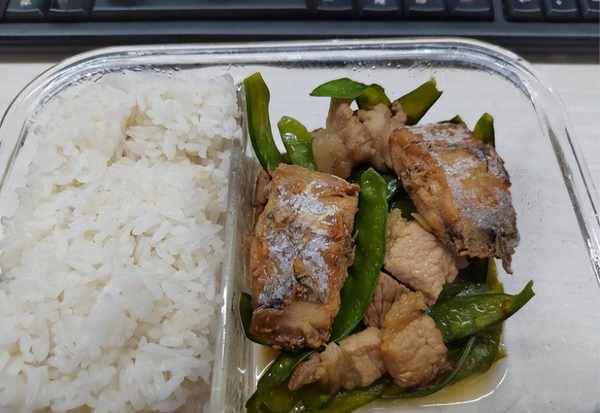 香煎带鱼一看就很好吃,鱼肉丝丝入味,每一口都是鲜香可口,咸淡适中,一条带鱼够王倩楠吃两天了,中午就放两块,就足够让王倩楠吃了一点米饭,再来一个荷兰豆炒瘦肉就够了,荷兰豆虽然颜色已经变暗变黄,但依然不失口感。