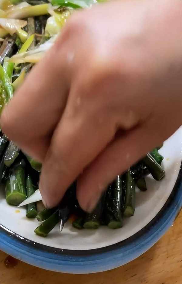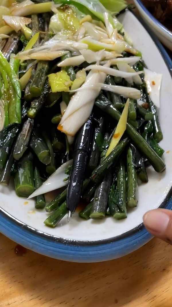 从该女子晒出的视频显示,店家端上了一盘炒菜苔,在菜苔中间还插着一根圆珠笔。由于两者颜色相近,不仔细看还真发现不了。