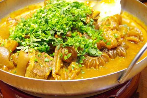 传统做法的的红烧猪蹄焖牛筋,上面被厨师大胆地撒着一大撮葱花和菜叶碎(绿帽子)。 在现在这个季节,一点也不违和。