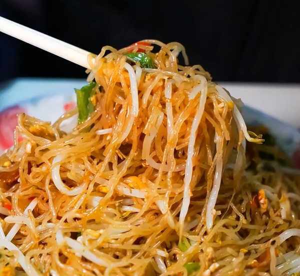 将米粉放入温热水中浸3-5分钟,过冷后捞起滤干水,配料炒熟后再放米粉拌炒1-2分钟即可。刚出的炒粉油而不腻,菜香诱人。