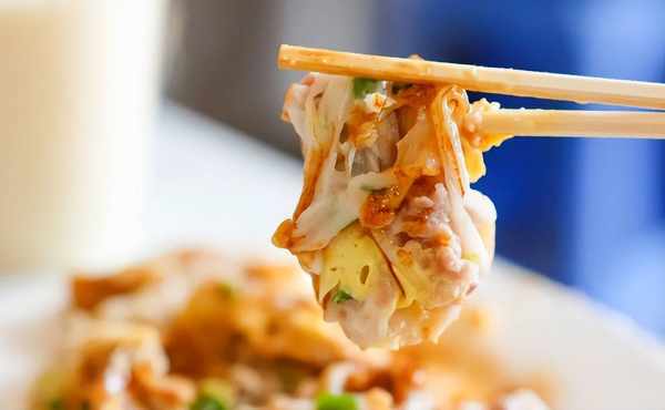 东莞人吃米制品从早晨开始,6点钟便有人起大早专门到烫粉店门口排队。烫粉就是莞式肠粉,比普通的肠粉皮更薄更嫩滑,甚至可透光。浇的也不是普通酱油,而是浇一勺烧鹅汁一勺点睛的烧鹅汁。