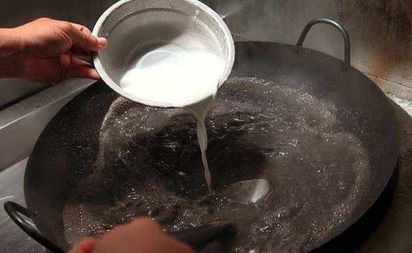 接着倒入白糖搅拌均匀,最后慢慢倒入在来米浆,一边倒时一边搅拌,直到有粘稠度就可以了。