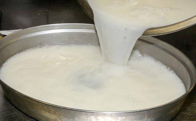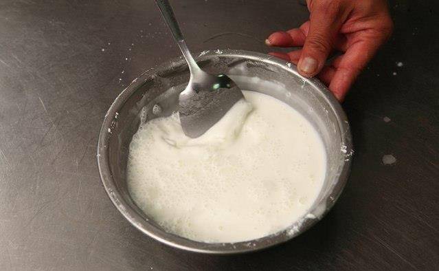 接着加入炼奶、杏仁露拌匀,倒入容器,放进冰箱冷藏约2小时,定型后即成杏仁豆腐。
