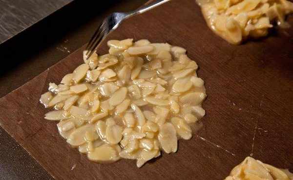 烤盘上垫上不沾烤焙布,用汤匙舀起杏仁片面糊铺上,再用叉子将重叠的杏仁片轻轻推开,送入烤箱以全火摄氏160度烤约1520分钟即可。