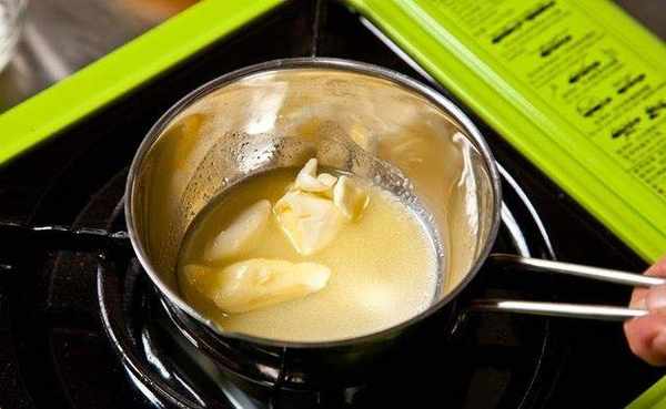 将奶油加热融化,可隔水加热或使用微波炉,若放在瓦斯炉上加热要稍微摇晃锅子,以免烧焦。