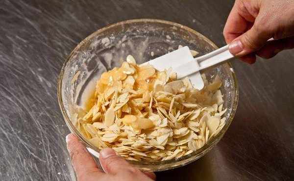放入步骤1的奶油、杏仁片,用搅拌棒轻轻翻拌。力道不要太大,以免将杏仁片弄碎。